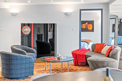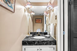 Tall built-ins lend a dramatic effect at the entry while offering abundant hidden storage. Italian marble powder room. Special lighting for art display.