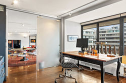 Den/home office/family room has built-in desk and shelving plus plenty of room to create your own space. Dramatic sliding translucent doors allow you to transform your space for privacy or openness.