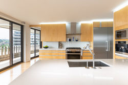 Floors are dressed in 5" Canadian White Maple in a single continuous orientation throughout the home in the direction of the river (no easy feat with the beautifully curved building architecture).