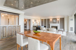 Living room features gas fireplace, custom fabric wall panels, and hidden door into the office/sitting room of the master suite. Dining room with custom Swarovski ceiling display and built-in glass display shelving. Sitting area with custom coffered and painted ceiling, Venetian plaster accent wall, and projection TV with drop-down screen.