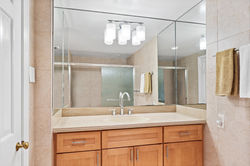 Tiled bath with wood vanity and modern lighting, large walk in shower.