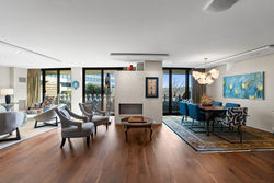 An inviting entry and beautiful walnut wood flooring welcome you into the main living area where newer floor to ceiling and picture windows with raw silk draperies span the entire perimeter. The expansive living room and dining area with modern fireplace opens to 40 ft long private balcony for outside dining with a scenic view of pool, gardens, Potomac River and Kennedy Center. There’s lots of art display space with accent lighting and sun protection treatment on windows as well as built-in custom designed bookcases and lighting.