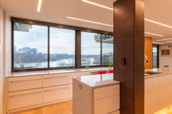 The dining area has a view that will make everyone linger at the table. The kitchen is truly a chef's dream with its own recessed herb garden. It features a large island for prepping and enteraining (while the boats go by the large picture windows), Wolf 6 burner gas stove, additional Wolf toasting oven, microwave, induction cooktop, Sub Zero refrigerator, wine refrigerator, 4 freezer drawers, panels that slide open to reveal a hidden TV, and an enormous hidden pantry.