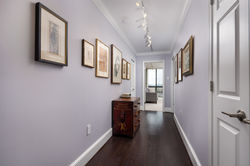 Large living room and separate formal dining room with beautiful hardwood floors and access to the balcony. Full-width built-in shelving in dining room. Ideal art display space with accent lighting throughout.